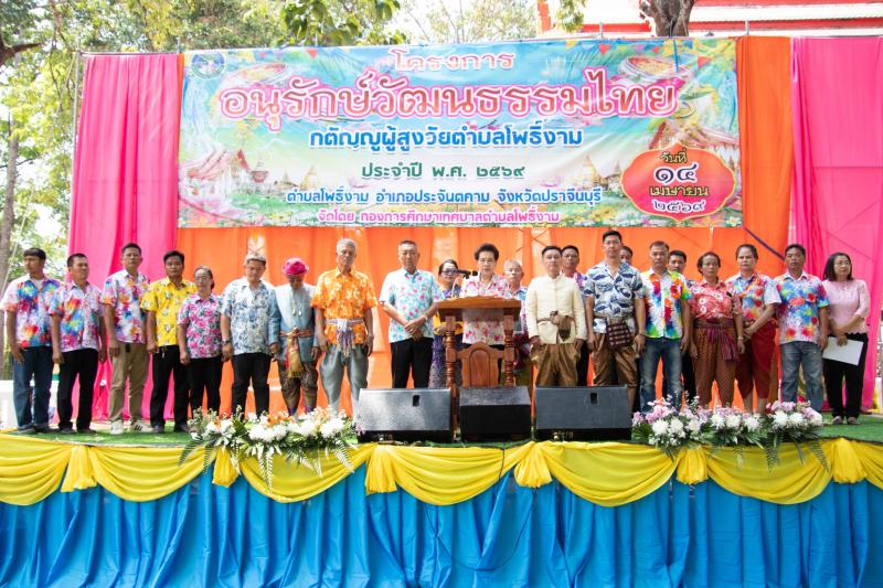 วันที่ 14 เมษายน 2569 ณ วัดบ้านโง้ง จ่าสิบเอก สุริยา รัตน์วิเศษฤทธิ์ หัวหน้าสำนักปลัด รักษาราชการแทนปลัดเทศบาล รักษาราชการแทน นายกเทศมนตรีตำบลโพธิ์งาม เป็นผู้กล่าวรายงานต่อประธานในพิธี โดยได้รับเกียรติจาก ท่าน ดร.บังอร วิลาวัลย์ ประธานสภาวัฒนธรรมจังหวัดปราจีนบุรี เป็นประธานเปิดงาน พร้อมด้วยสมาชิกสภาเทศบาลตำบลโพธิ์งาม กำนันผู้ใหญ่บ้านผู้นำชุมชน และประธานสภาวัฒนธรรมตำบลโพธิ์งาม เข้าร่วมในโครงการนี้อย่างพร้อมเพรียงกัน >>>เพื่อเป็นการอนุรักษ์สืบสานประเพณีวัฒนธรรมไทย แสดงความกตัญญูต่อผู้สูงวัย และในโครงการยังมีกิจกรรมการประกวดแข่งขันภูมิปัญญาท้องถิ่นของตำบลโพธิ์งามการถักไม้กวาดดอกหญ้า การแข่งส่งขันส้มตำลีลาการประกวดร้องเพลงลูกทุ่ง รุ่นอายุ 60 ปีขึ้นไป และการแต่งกายชุดไทยรุ่นอายุ 60 ปีขึ้นไป