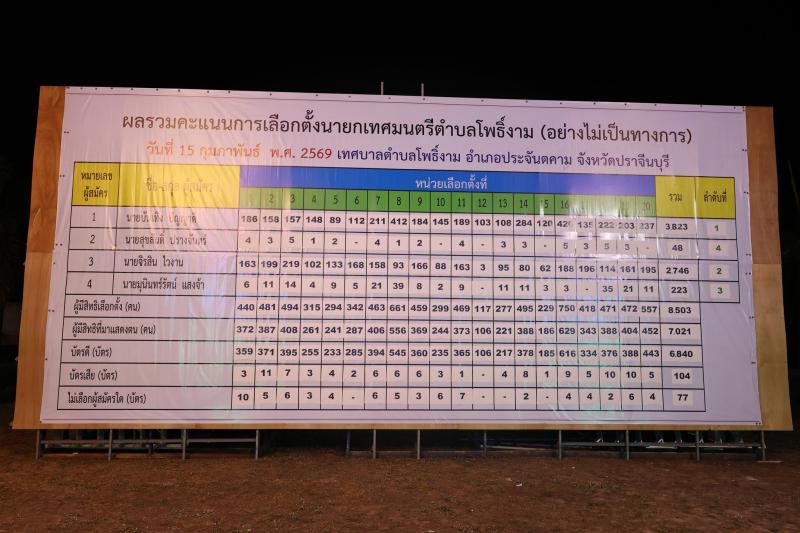 description ตามที่ได้มีการจัดการเลือกตั้งขึ้นในเขตเทศบาลตำบลโพธิ์งาม ???????? ทางศูนย์ประสานงานการเลือกตั้งประจำเทศบาลตำบลโพธิ์งาม ขอแจ้งสรุปผลการรวมคะแนนของผู้สมัครรับเลือกตั้ง นายกเทศมนตรีตำบลโพธิ์งาม ทุกหมายเลข ดังนี้ ???? หมายเลข 1 นายบันเทิง ปัญญาดี ได้คะแนนรวม: 3823 คะแนน หมายเลข 2 นายสุขสันติ์ ปรางจันทร์ ได้คะแนนรวม: 48 คะแนน หมายเลข 3 นายจิรสิน ไวงาน ได้คะแนนรวม: 2746 คะแนน หมายเลข 4 นายมุนินทร์รัตน์ แสงจ้า ได้คะแนนรวม: 223 คะแนน หมายเหตุ: ข้อมูลข้างต้นเป็นผลคะแนนเบื้องต้น "อย่างไม่เป็นทางการ" โปรดติดตามการประกาศผลการเลือกตั้งอย่างเป็นทางการจากสำนักงานคณะกรรมการการเลือกตั้ง (กกต.) อีกครั้ง person admin