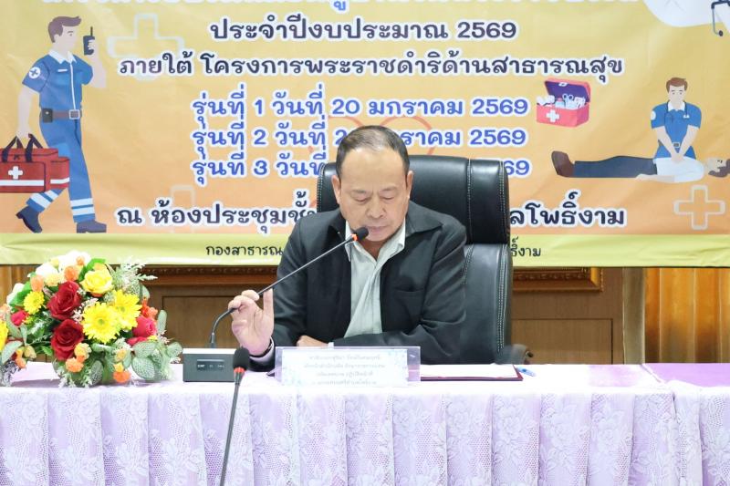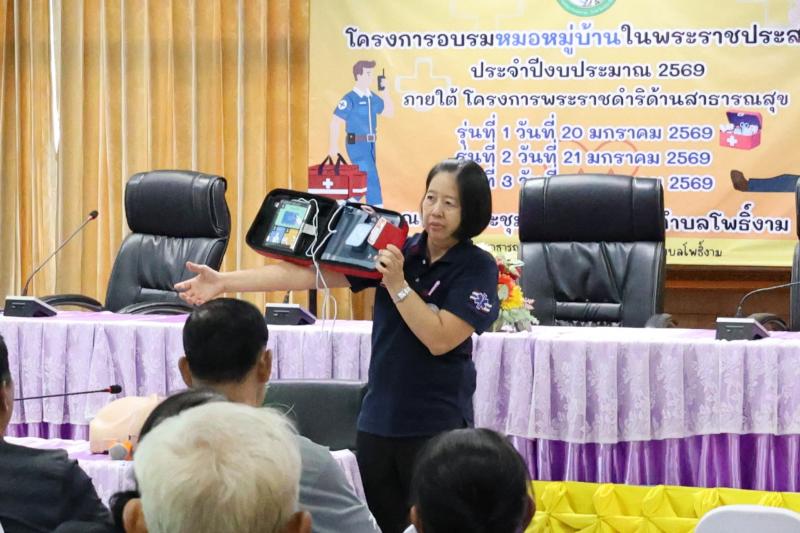 description วันที่ 20 มกราคม 2569 เวลา 09.00 น. จ่าสิบเอกสุริยา รัตน์วิเศษฤทธิ์ หัวหน้าสำนักปลัด รักษาราชการแทน ปลัดเทศบาล ปฏิบัติหน้าที่ นายกเทศมนตรีตำบลโพธิ์งาม ให้เกียรติเป็นประธานในโครงการหมอหมู่บ้านในพระราชประสงค์ ประจำปีงบประมาณ 2569 ณ ห้องประชุมเทศบาลตำบลโพธิ์งาม โดยมี หัวหน้าส่วนราชการ พนักงานเทศบาล ลูกจ้าง เจ้าหน้าที่เทศบาลตำบลโพธิ์งาม เข้าร่วมในพิธีเปิดโครงการฯ นี้ด้วย ในโครงการฯ มีกิจกรรมฝึกอบรมให้ความรู้เรื่องการปฐมพยาบาลเบื้องต้นอย่างถูกวิธี การสาธิตแบ่งกลุ่มฝึกปฏิบัติการช่วยขั้นพื้นฐาน (CPR) และการใช้เครื่องกระตุ้นไฟฟ้าหัวใจอัตโนมัติ (AED) โดยวิทยากรผู้เชี่ยวชาญด้านการแพทย์ฉุกเฉินจังหวัดปราจีนบุรี เพื่อให้ความรู้แก่ อาสาสมัครสาธารณสุขประจำหมู่บ้าน จิตอาสาสาธารณสุข และประชาชนที่สนใจ person admin