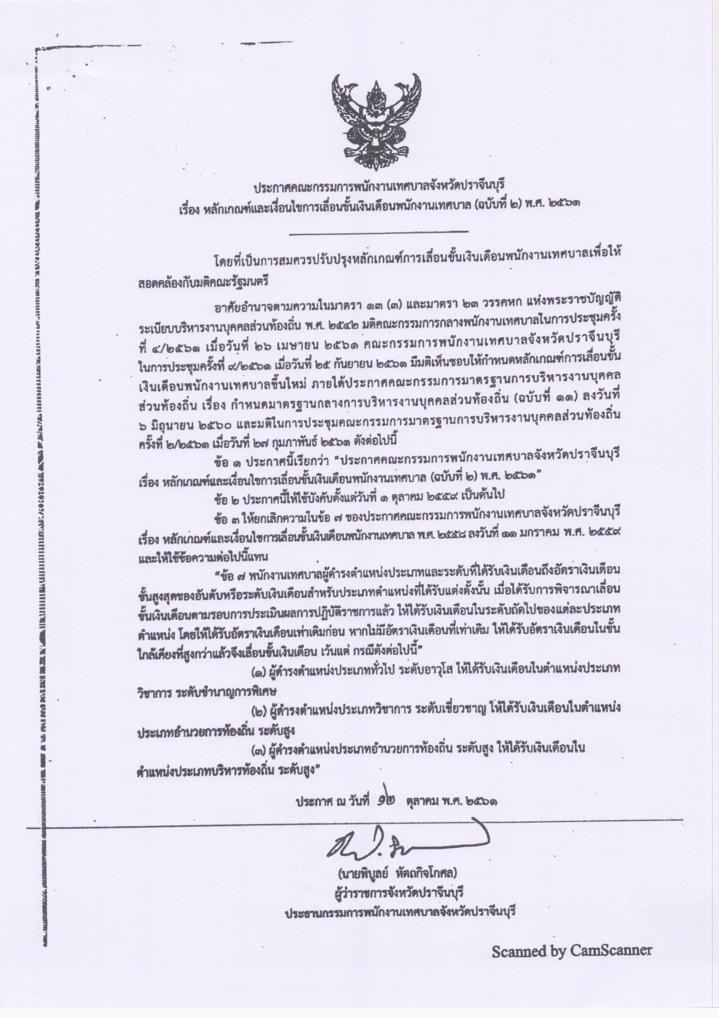 เรื่อง หลักเกณฑ์และเงื่อนไขการเลื่อนขั้นเงินเดือนพนักงานเทศบาล (ฉบับที่ 2) พ.ศ.2561