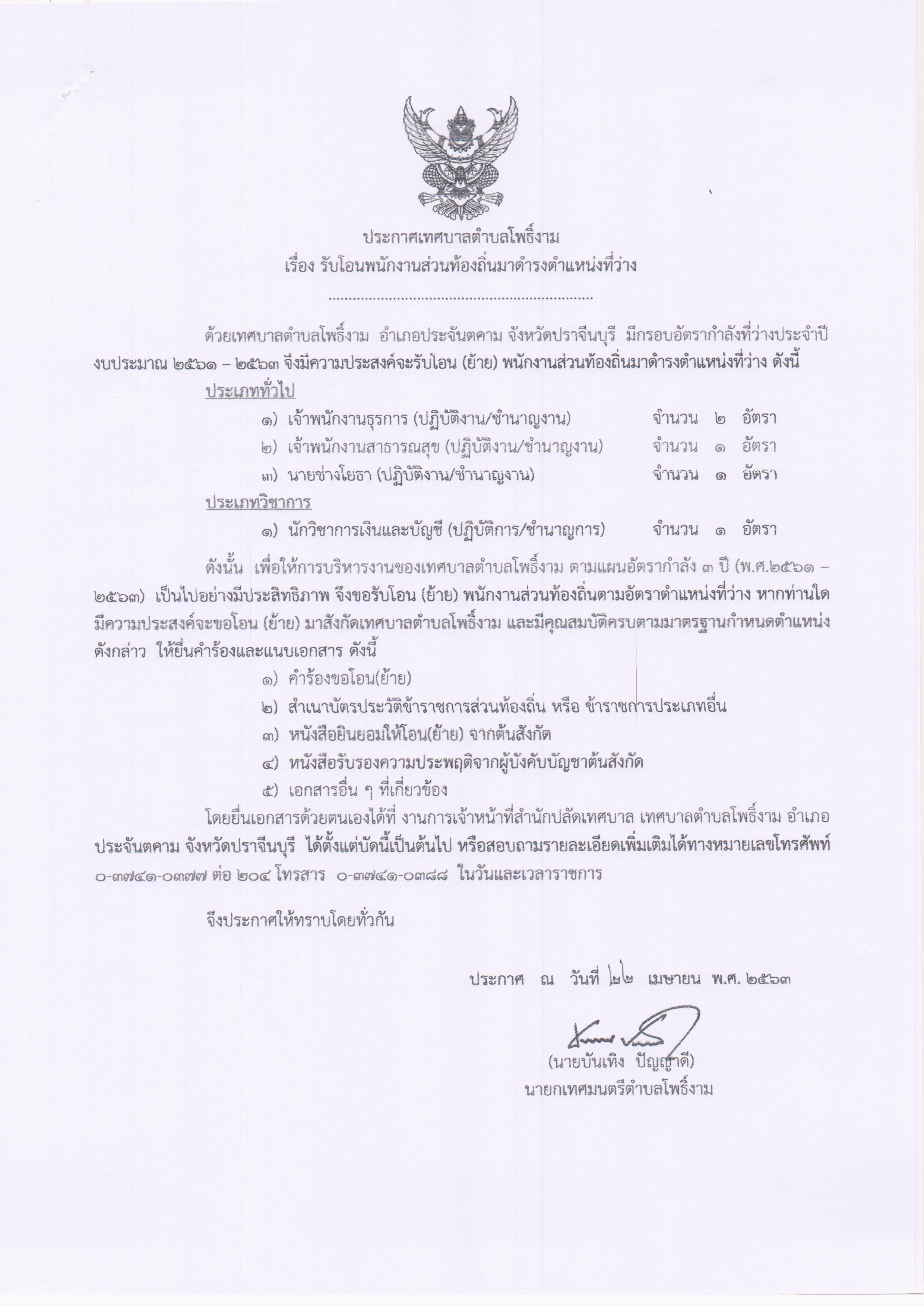 ประกาศเทศบาลตำบลโพธิ์งาม เรื่อง ประชาสัมพันธ์การรับโอนพนักงานส่วนท้องถิ่นมาดำรงตำแหน่งที่ว่าง