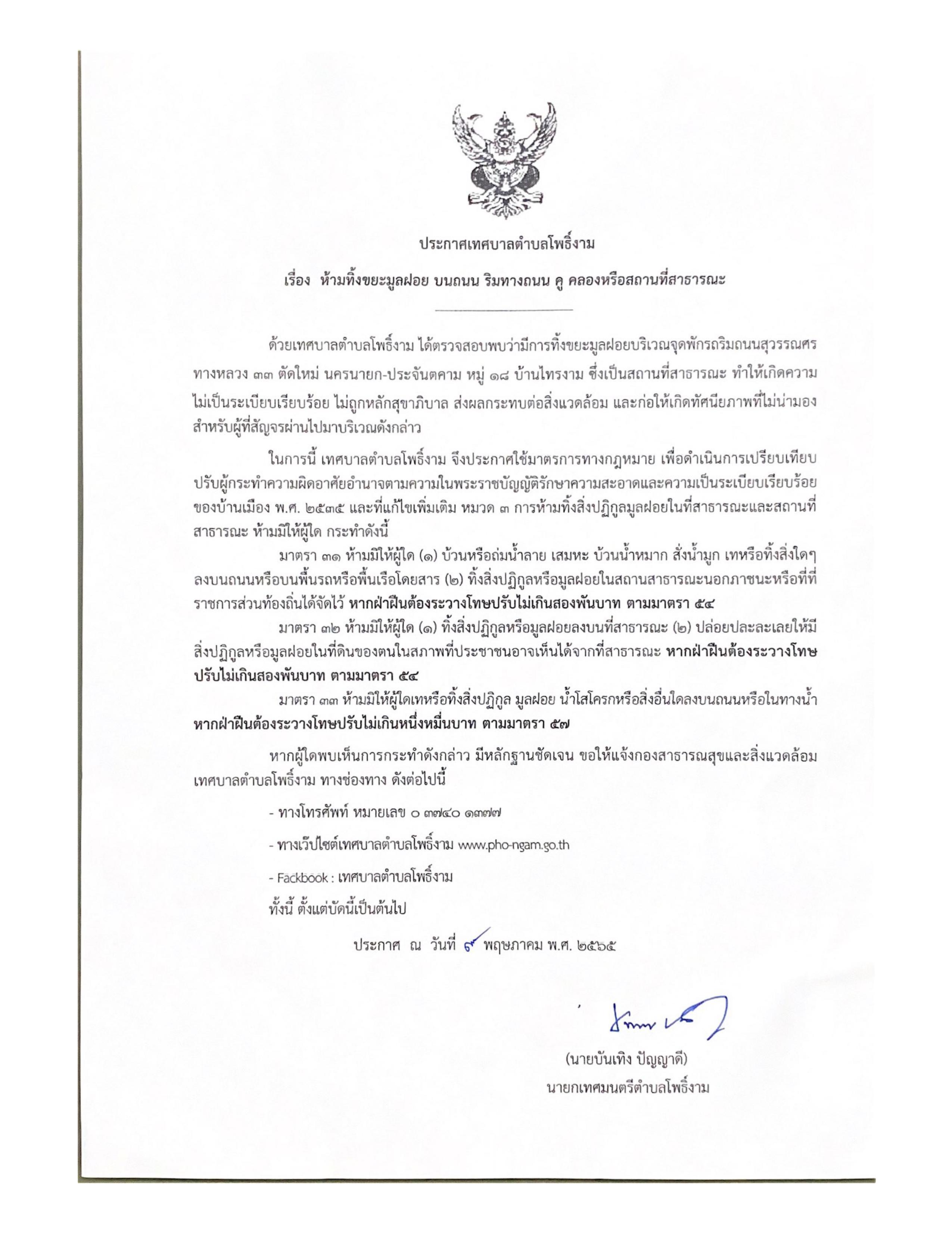 ประกาศเทศบาลตำบลโพธิ์งาม เรื่อง ห้ามทิ้งขยะมูลฝอย บนถนน ริมทางถนน คู คลองหรือสถานที่สาธารณะ