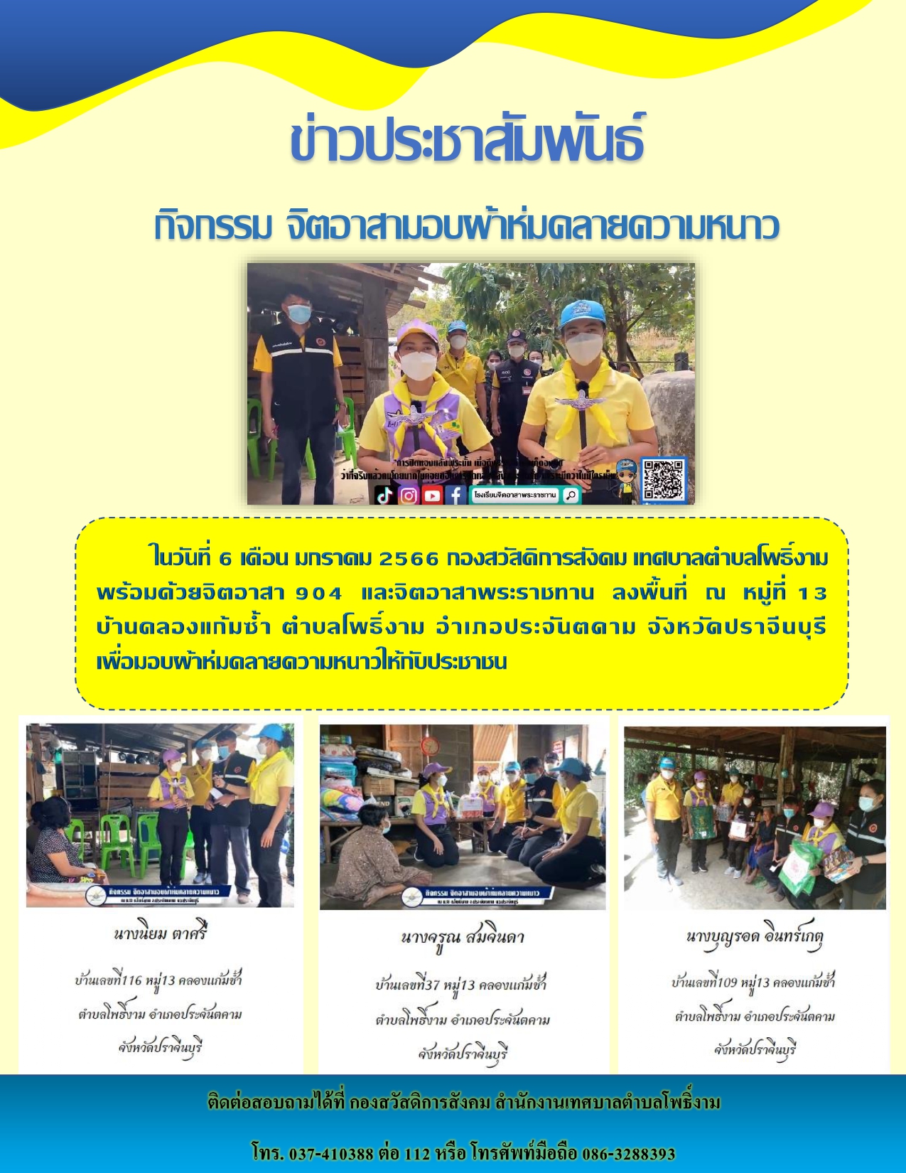 รายละเอียด : กิจกรรมจิตอาสามอบผ้าห่มคลายความหนาว ของอุปโภค บริโภค และอุปกรณ์สิ่งของพระราชทาน ณ บ้านคลองแก้มช้ำ หมู่ที่ ๑๓ ตำบลโพธิ์งาม อำเภอประจันตคาม จังหวัดปราจีนบุรี ให้แก่ผู้สูงอายุ ผู้พิการ ผู้ป่วยติดเตียง และนักเรียนศูนย์พัฒนาเด็กเล็กเทศบาลตำบลโพธิ์งาม