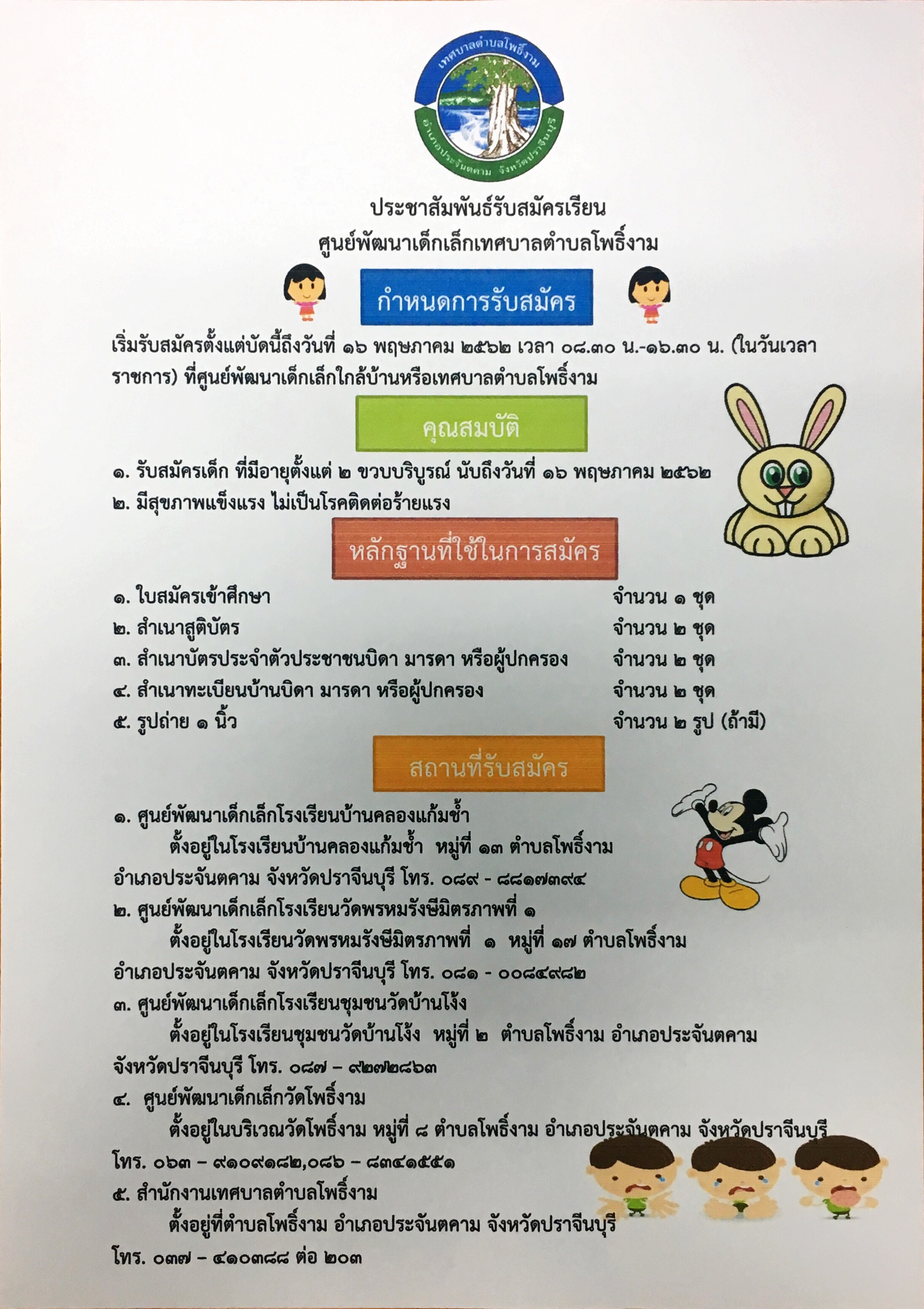ประชาสัมพันธ์การรับสมัครเรียน ศูนย์พัฒนาเด็กเล็กเทศบาลตำบลโพธิ์งาม