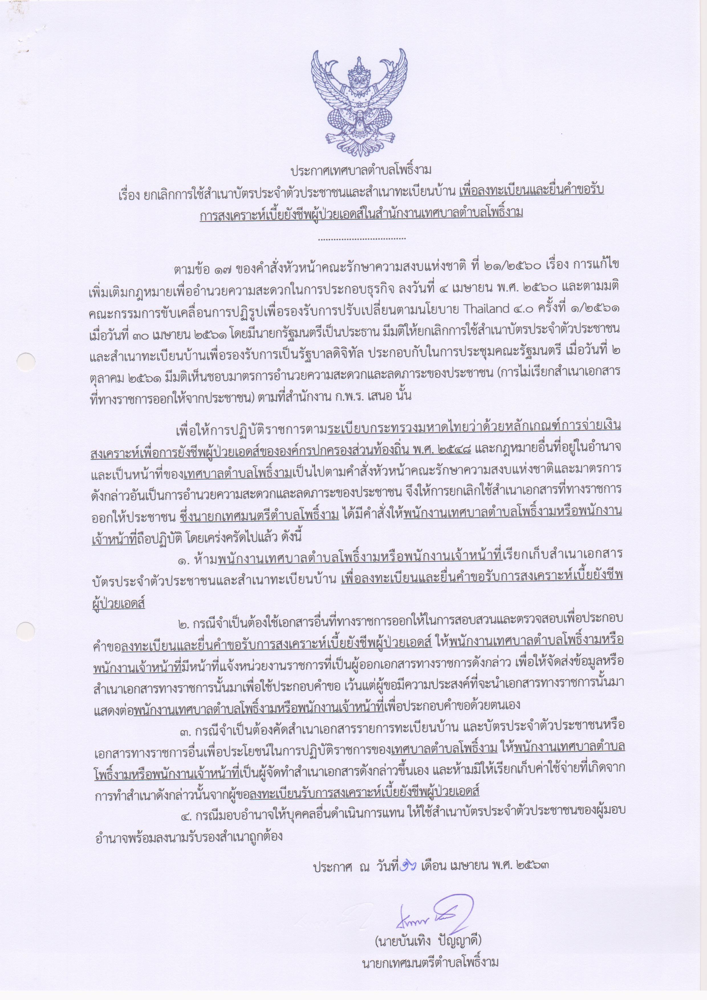 ประกาศเทศบาลตำบลโพธิ์งาม เรื่อง ยกเลิกการใช้สำเนาบัตรประจำตัวประชาชนและสำเนาทะเบียนบ้านเพื่อลงทะเบียนและยื่นคำขอรับการสงเคราะห์เบี้ยยังชีพผู้ป่วยเอดส์