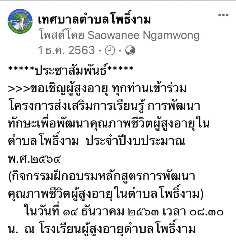 >>>ขอเชิญผู้สูงอายุ ทุกท่านเข้าร่วมโครงการส่งเสริมการเรียนรู้ การพัฒนาทักษะเพื่อพัฒนาคุณภาพชีวิตผู้สูงอายุในตำบลโพธิ์งาม ประจำปีงบประมาณ พ.ศ.๒๕๖๔