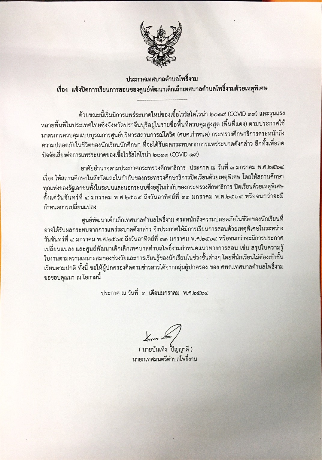 ประกาศเทศบาลตำบลโพธิ์งาม เรื่องแจ้งปิดการเรียนการสอนของศูนย์พัฒนาเด็กเล็กเทศบาลตำบลโพธิ์งามด้วยเหตุพิเศษ