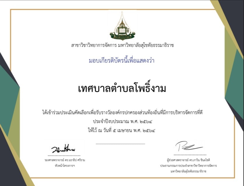 เทศบาลตำบลโพธิ์งาม ผ่านการประเมินคัดเลือกองค์กรปกครองส่วนท้องถิ่นที่มีการบริหารจัดการที่ดี ประจำปีงบประมาณ พ.ศ.๒๕๖๔ (รอบที่ ๑)