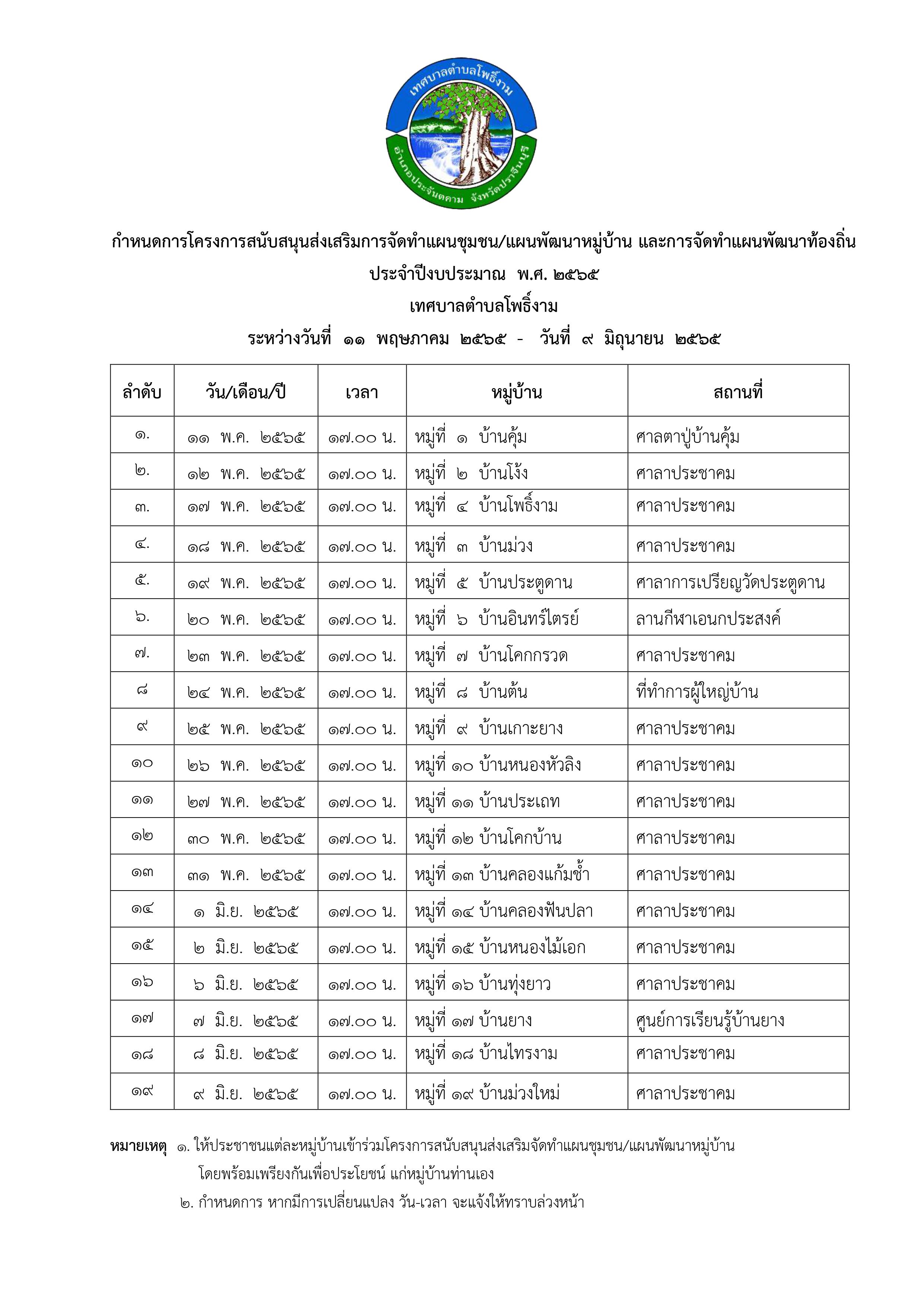 กำหนดการโครงการสนับสนุนส่งเสริมการจัดทำแผนชุมชน/แผนพัฒนาหมู่บ้าน และการจัดทำแผนพัฒนาท้องถิ่น ประจำปีงบประมาณ ๒๕๖๕
