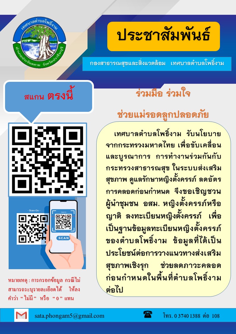 ๑. ประชาสัมพันธ์เชิญชวนสำรวจข้อมูลทะเบียนหญิงตั้งครรภ์ตำบลโพธิ์งาม