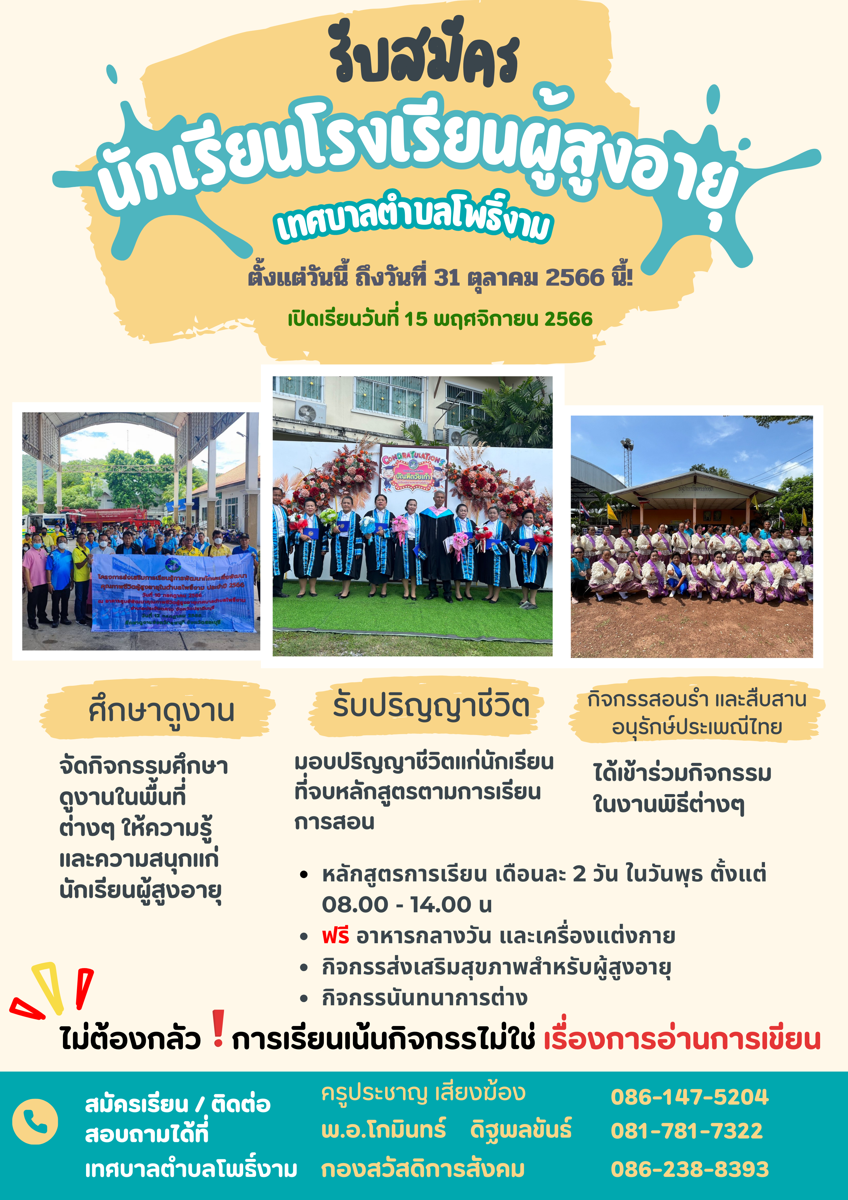 ชื่อเรื่อง : ประชาสัมพันธ์การสมัครเข้าเรียนโรงเรียนผู้สูงอายุเทสบาลตำบลโพธิ์งาม รุ่นที่ 3/2566
