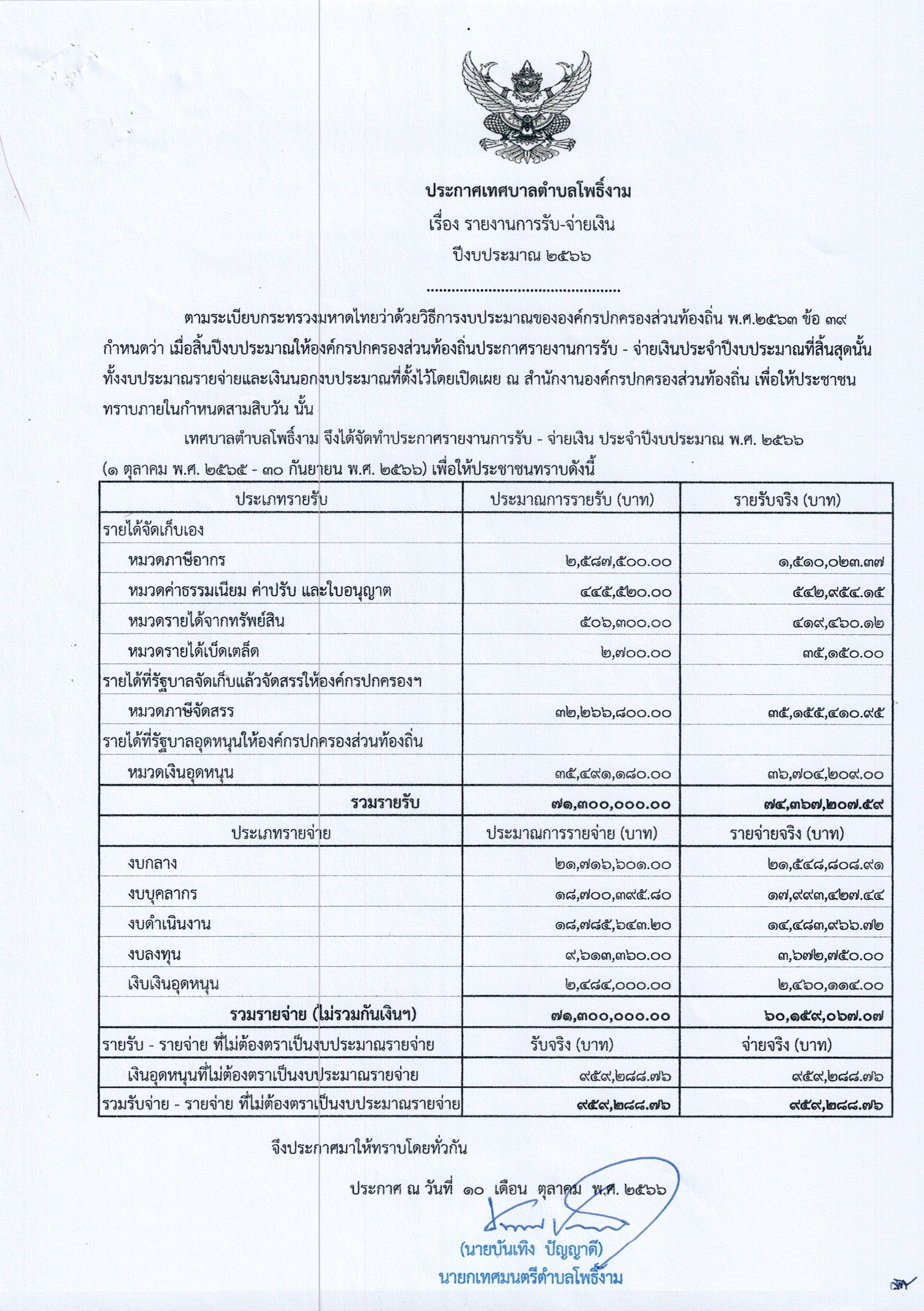 ประกาศเทศบาลตำบลโพธิ์งาม เรื่องรายงานการับ-จ่ายเงิน ประจำปีงบประมาณ 2566