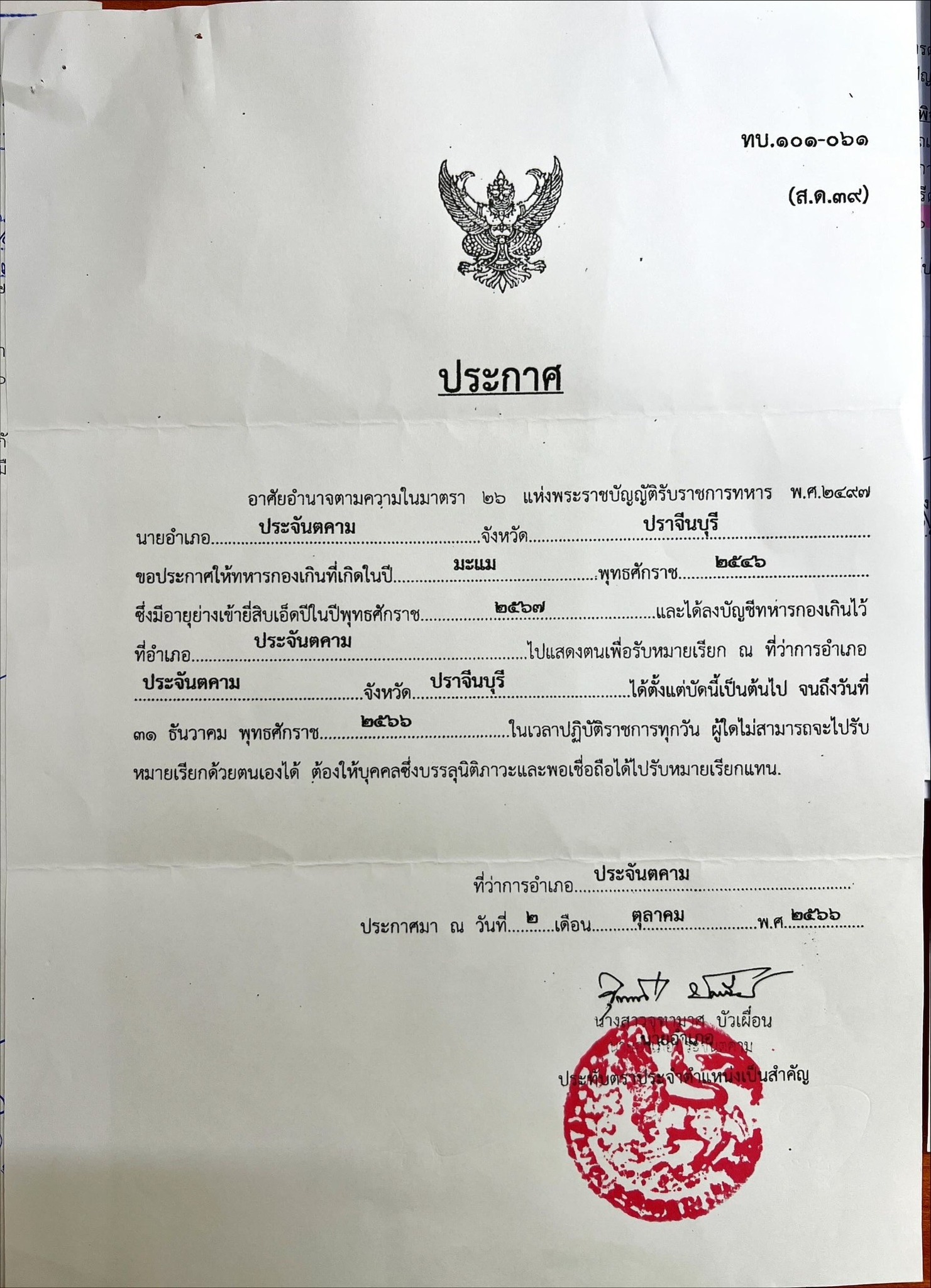รายละเอียด : ขอประกาศให้ทหารกองเกินที่เกิดในปี มะแม พุทธศักราช ๒๕๔๖ ซึ่งมีอายุย่างเข้ายี่สิบเอ็ดปี ในปีพุทธศักราช ๒๕๖๗ และได้ลงบัญชีทหารกองเกินไว้ที่อำเภอประจันตคาม จังหวัดปราจีนบุรี ได้ตั้งแต่บัดนี้เป็นต้นไป จนถึงวันที่ ๓๑ ธันวาคม ๒๕๖๖ ในเวลาปฏิบัติราชการทุกวัน ผู้ใดไม่สามารถจะไปรับหมายเรียกด้วยตนเองได้ ต้องให้บุคคลซึ่งบรรลุนิติภาวะและพอเชื่อถือได้ไปรับหมายเรียกแทน