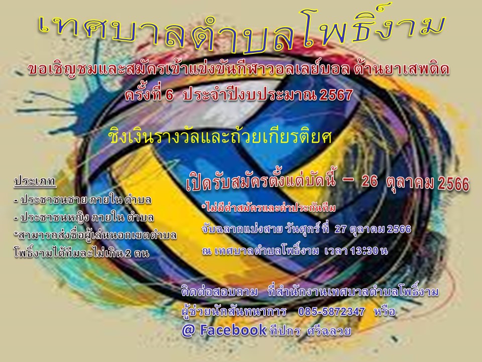 ประชาสัมพันธ์ การรับสมัครแข่งขันวอลเล่บอล ต้านยาเสพติดตำบลโพธิ์งาม ครั้งที่ ๖ ประจำปีงบประมาณ ๒๕๖๗