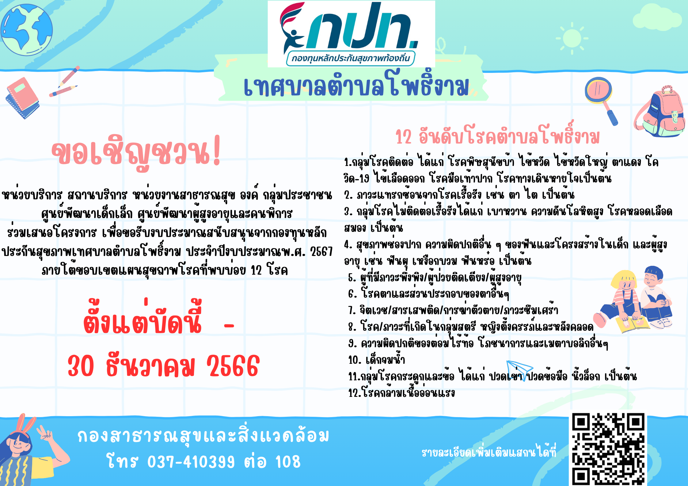 รายละเอียด : ขอเชิญชวน องค์กรหรือกลุ่มประชาชน สถานบริการ หน่วยบริการ หรือหน่วยงานอื่นๆ ร่วมเสนอโครงการเพื่อขอรับงบประมาณสนับสนุนจากกองทุนหลักประกันสุขภาพเทศบาลตำบลโพธิ์งาม ในการจัดทำโครงการที่เกี่ยวข้องกับการป้องกัน ส่งเสริม และดูแลสุขภาพให้กับประชาชนในพื้นที่ ประจำปีงบประมาณ ๒๕๖๗ ส่งได้ตั้งแต่วันนี้ - ๓๐ ธันวาคม ๒๕๖๖ ที่กองสาธารณสุขและสิ่งแวดล้อม เทศบาลตำบลโพธิ์งาม ติดต่อสอบถามเพิ่มเติมโทร ๐๓๗ ๔๑๐๓๘๘ ต่อ ๑๐๘ (ตามวันและเวลาราชการ)