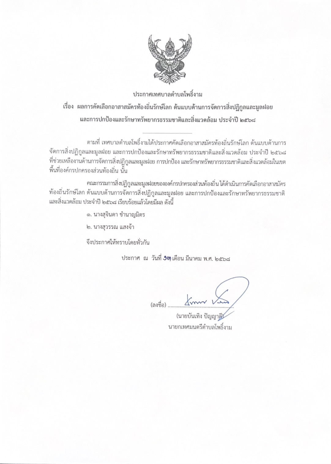 ประกาศเทศบาลตำบลโพธิ์งาม เรื่อง ผลการคัดเลือกอาสาสมัครท่องถิ่นรักษ์โลก ต้นแบบด้านการจัดการสิ่งปฏิกูลและมูลฝอยและการป้องกันและรักษาทรัพยากรธรรมชาติและส