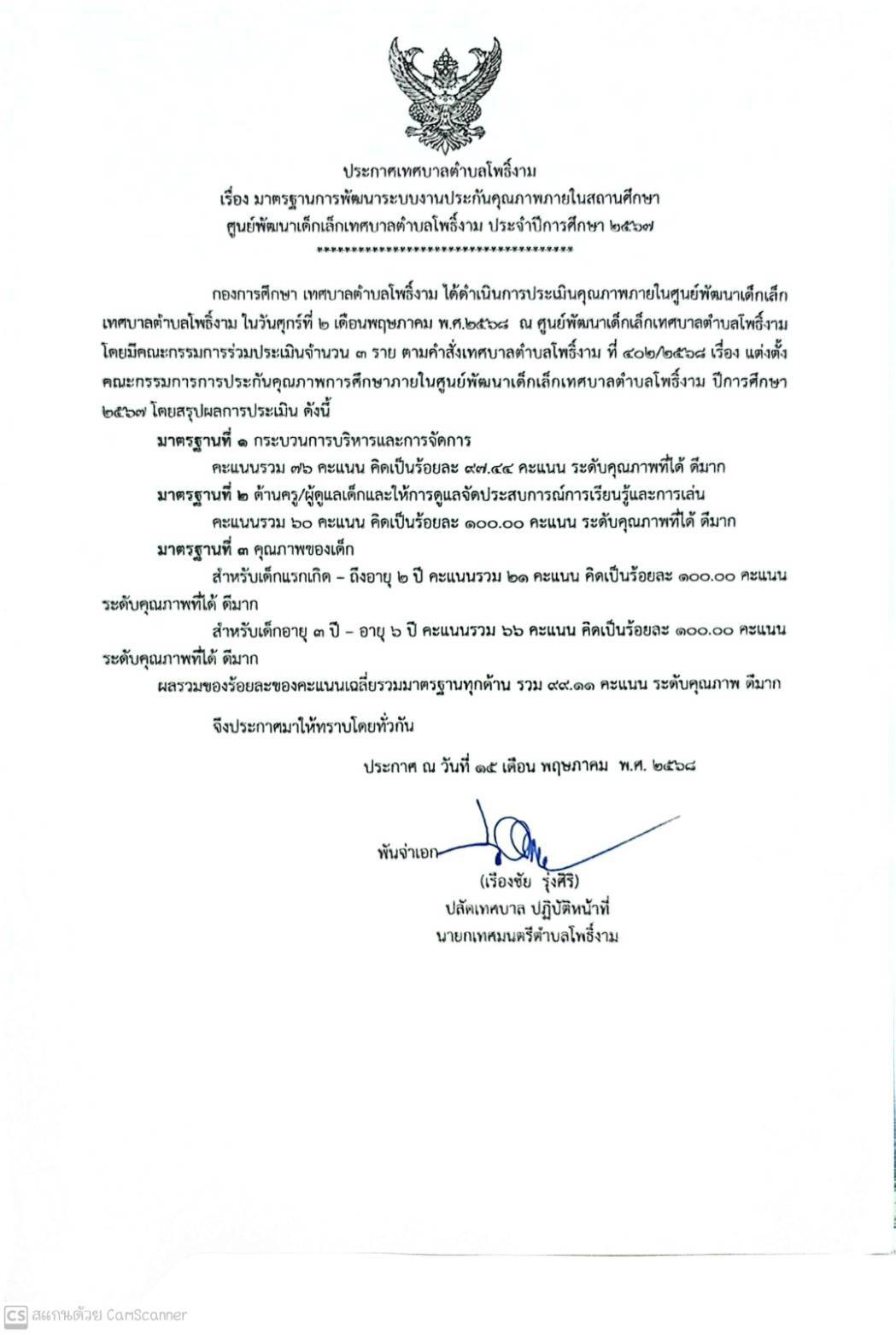 ประกาศเทศบาลตำบลโพธิ์งาม เรื่อง มาตรฐานการพัฒนาระบบงานประกันคุณภาพภายในสถานศึกษา ศูนย์พัฒนาเด็กเล็กเทศบาลตำบลโพธิ์งาม ประจำปีการศึกษา 2567