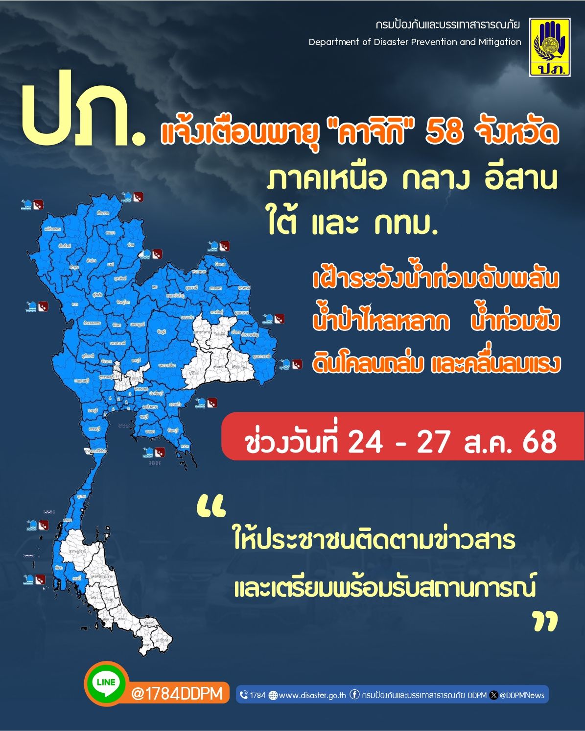 ปภ. แจ้งเตือนพายุ "คาจิกิ" 58 จังหวัด ในพื้นที่ภาคเหนือ ภาคตะวันออกเฉียงเหนือ ภาคกลาง ภาคใต้ และ กทม. เฝ้าระวังสถานการณ์น้ำท่วมฉับพลัน น้ำป่าไหลหลาก น