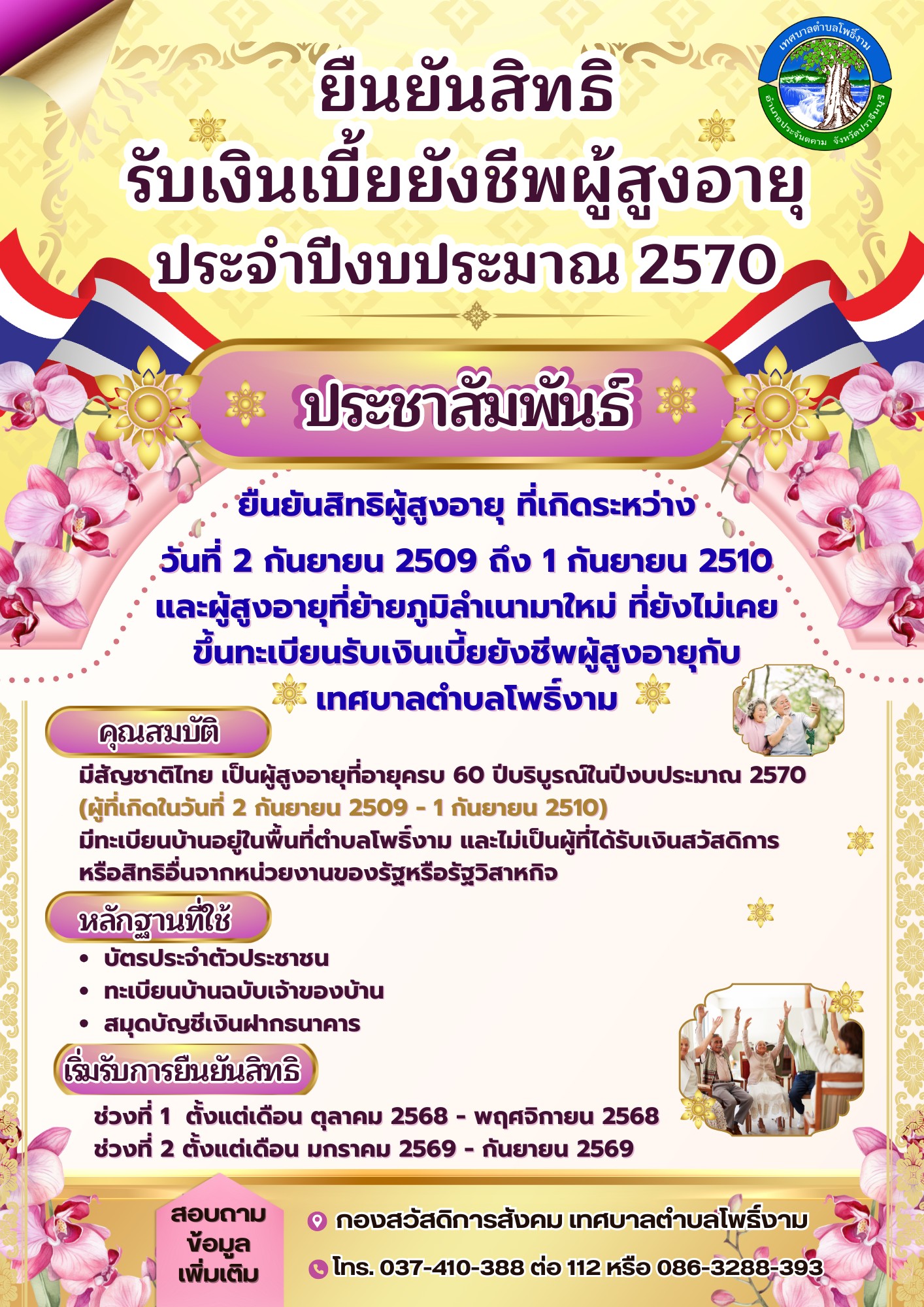 ชื่อเรื่อง : ประชาสัมพันธ์ การยืนยันสิทธิรับเงินเบี้ยยังชีพผู้สูงอายุ ประจำปีงบประมาณ 2570