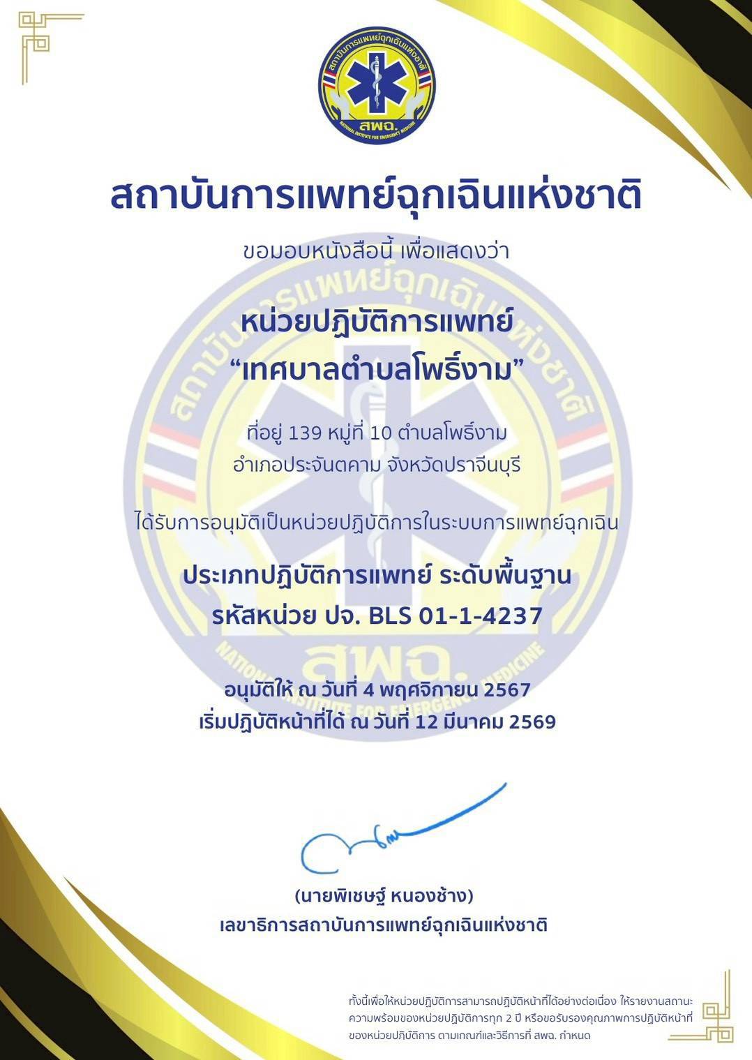 กองสาธารณสุขและสิ่งแวดล้อม เทศบาลตำบลโพธิ์งาม ได้เข้าร่วมการตรวจประเมิน หน่วยปฏิบัติการในระบบบริการแพทย์ฉุกเฉิน จังหวัดปราจีนบุรี และได้ผ่านการประเมิน