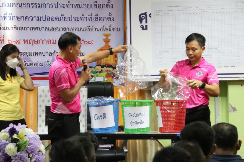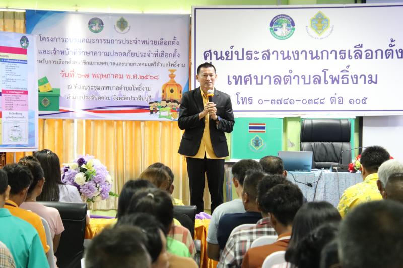 รายละเอียด : วันที่ 7 พฤษภาคม 2567 เวลา 09.00 น. เทศบาลตำบลโพธิ์งาม จัดโครงการอบรมคณะกรรมการประจำหน่วยเลือกตั้งและเจ้าหน้าที่รักษาความปลอดภัยประจำที่เลือกตั้ง สำหรับการเลือกตั้งสมาชิกสภาเทศบาลและนายกเทศมนตรีตำบลโพธิ์งาม ณ ห้องประชุมเทศบาลตำบลโพธิ์งาม ได้รับเกียรติจาก นายกองตรี ปพนศักดิ์ ขันติชัยมงคล นายอำเภอประจันตคาม เป็นประธานเปิดโครงการ โดยพันจ่าเอก เรืองชัย รุ่งศิริ ปลัดเทศบาล ปฏิบัติหน้าที่ นายกเทศมนตรีตำบลโพธิ์งาม กล่าวรายงานวัตถุประสงค์ของโครงการฯ ซึ่งนายอำเภอฯได้ให้ข้อเสนอแนะเพิ่มเติมพร้อมกับกำชับการปฏิบัติหน้าที่ ให้สุจริต ถูกต้อง โปร่งใส ของคณะกรรมการประจำหน่วยเลือกตั้งและเจ้าหน้าที่รักษาความปลอดภัยฯ ด้วย