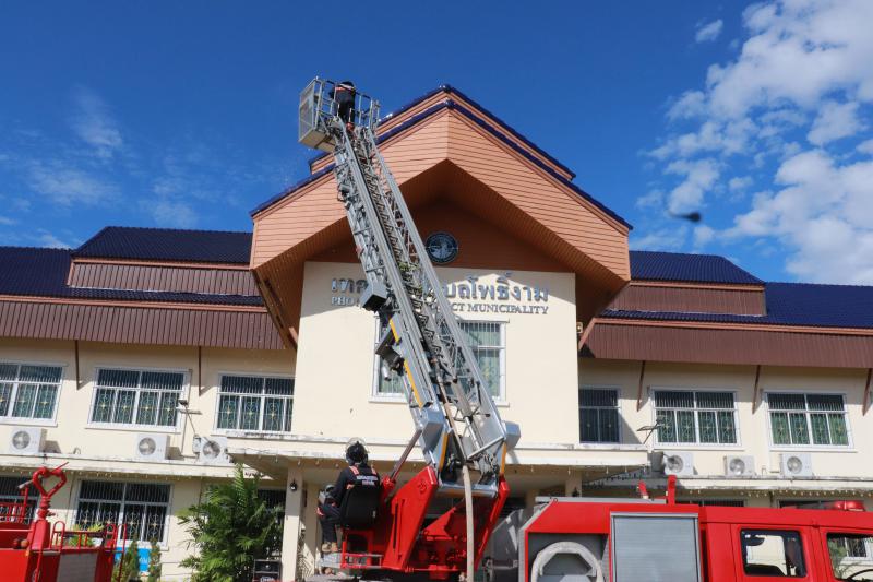 การทดสอบระบบ เพื่อซักซ้อมสมรรถนะ ของรถดับเพลิงพร้อมบันไดสูง ๑๓ เมตร เข้าประจำการ ณ เทศบาลตำบลโพธิ์งาม