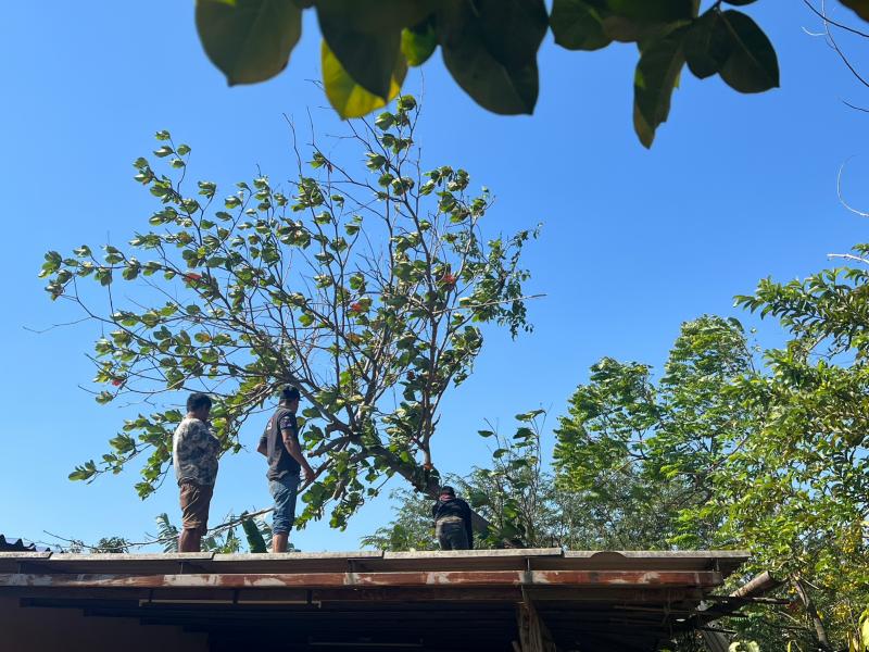 รายละเอียด : วันที่ ๑๘ ธันวาคม ๒๕๖๕ เวลา ๑๑.๔๐ น. งานป้องกันและบรรเทาสาธารณภัยเทศบาลตำบลโพธิ์งาม ได้รับแจ้งจากผู้ใหญ่บ้าน หมู่ที่ ๑๘ บ้านไทรงาม เกิดเหตุวาตภัย มีลมกรรโชกแรงต้นไม้ขนาดใหญ่หักทับหลังคาบ้านเรือนประชาชน หลังได้รับแจ้งจึงได้ลงพื้นที่ตรวจสอบ พบว่าต้องทำการตัดกิ่งไม้ที่มีขนาดใหญ่ออกเพื่อสำรวจความเสียหายของกระเบื้องหลังคาต่อไป