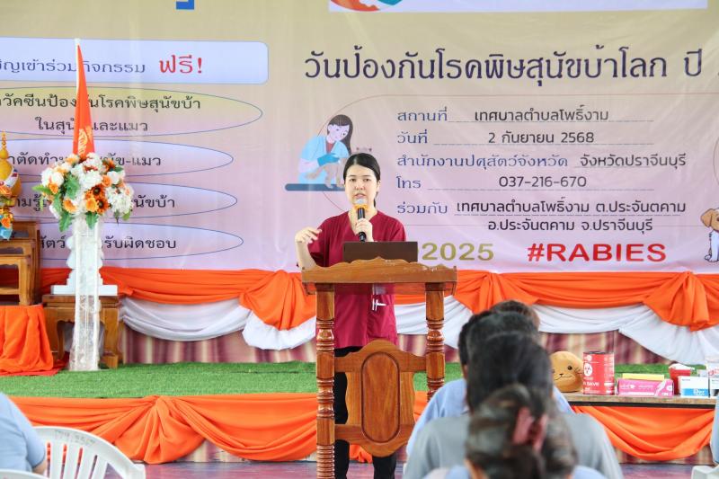 รายละเอียด : วันที่ 2 กันยายน 2568 กองสาธารณสุขและสิ่งแวดล้อม เทศบาลตำบลโพธิ์งาม จัดโครงการรณรงค์ป้องกันโรคพิษสุนัขบ้า ประจำปีงบประมาณ 2568 ภายใต้โครงการสัตว์ปลอดโรค คนปลอดภัย ตามพระปณิธานของศาสตราจารย์ ดร.สมเด็จพระเจ้าลูกเธอเจ้าฟ้าจุฬาภรณวลัยลักษณ์ อัครราชกุมารี โดยนายเอกชัย เกรียงธนบดี นายกเทศมนตรีตำบลโพธิ์งาม กล่าวให้การต้อนรับนายชนาธิป โคกมณี รองผู้ว่าราชการจังหวัดปราจีนบุรี ให้เกียรติเป็นประธานเปิดโครงการฯ พร้อมด้วยหัวหน้าส่วนราชการในจังหวัดปราจีนบุรี เดินทางมาร่วมโครงการฯ นี้ด้วย