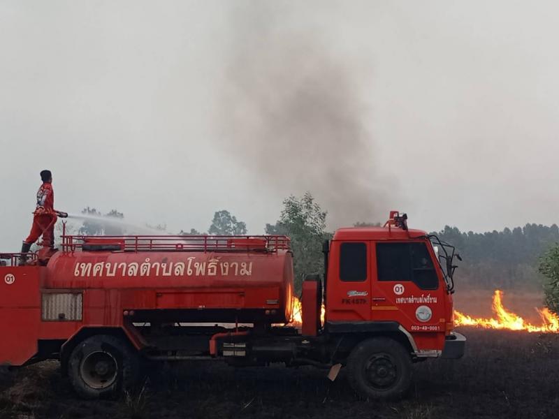 รายละเอียด : วันที่ ๔ เมษายน ๒๕๖๖ เวลา ๑๓.๐๐ น. งานป้องกันและบรรเทาสาธารณภัยเทศบาลตำบลโพธิ์งาม ได้รับแจ้งเกิดเหตุไฟไหม้หญ้าแห้งท้ายหมู่บ้านไทรงาม ลุกลามเป็นบริเวณกว้างจนถึงถนน ๓๓ ใหม่ช่วงหมู่ที่ ๑๘ ตำบลโพธิ์งาม เจ้าหน้าที่งานป้องกันและบรรเทาสาธารณภัย ออกระงับเหตุไฟไหม้เร่งฉีดน้ำเพื่อดับไฟ แต่ด้วยเหตุไฟได้ลามขยายเป็นวงกว้าง จึงต้องใช้รถน้ำออกปฏิบัติการ ๒ คัน สลับกันเข้าพื้นที่ไฟไหม้ ด้วยเป็นพื้นที่หญ้าแห้งจึงทำให้ต้องใช้เวลาประมาณ ๓ ชั่วโมงกว่า จึงสามารถควบคุมเพลิงไว้ได้