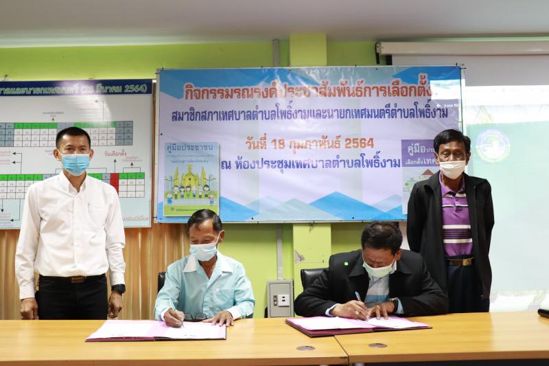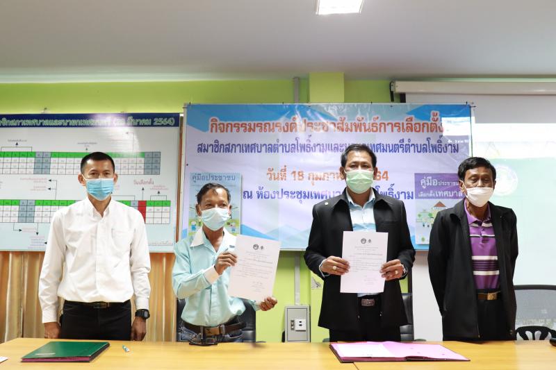 รายละเอียด : วันที่ ๑๘ กุมภาพันธ์ ๒๕๖๔ เวลา ๐๙.๓๐ น. เทศบาลตำบลโพธิ์งาม จัดกิจกรรมรณรงค์ประชาสัมพันธ์การเลือกตั้งสมาชิกสภาเทศบาลและนายกเทศมนตรีตำบลโพธิ์งาม โดยมีนายสุวัจน์ บัวจันทร์ ประธานกรรมการการเลือกตั้งประจำเทศบาลตำบลโพธิ์งาม เป็นประธานโครงการฯ ในการปฏิญาณตนของผู้สมัครต่อหน้ากำนัน ผู้ใหญ่บ้านตำบลโพธิ์งาม และมอบคู่มือประชาชน เลือกตั้งเทศบาล พร้อมกันนี้ได้ให้คำแนะนำกับกำนัน ผู้ใหญ่บ้าน ในการคัดเลือกเจ้าหน้าที่ผู้ปฏิบัติงานประจำหน่วยเลือกตั้ง