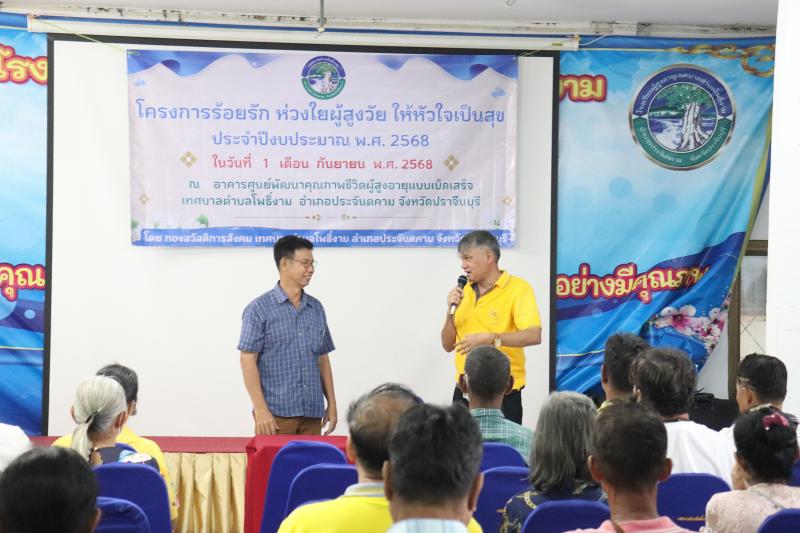 รายละเอียด : วันที่ 1 กันยายน 2568 นายเอกชัย เกรียงธนบดี นายกเทศมนตรีตำบลโพธิ์งาม เป็นประธานเปิดโครงการร้อยรัก ห่วงใยผู้สูงวัย ให้หัวใจเป็นสุข (อบรมให้ความรู้เรื่องสิทธิและสวัสดิการที่เกี่ยวข้องกับผู้สูงอายุ) ประจำปีงบประมาณ พ.ศ.2568 โดยมีหัวหน้าส่วนราชการ พนักงาน เจ้าหน้าที่ เทศบาลตำบลโพธิ์งาม เข้าร่วมกิจกรรมในครั้งนี้ด้วย