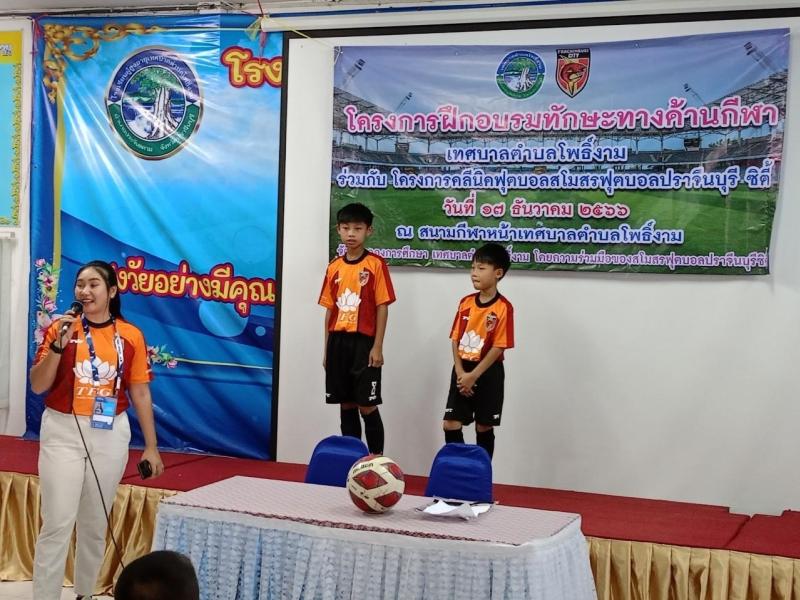 รายละเอียด : วันที่ ๑๗ ธันวาคม ๒๕๖๖ กองการศึกษา เทศบาลตำบลโพธิ์งาม จัดโครงการส่งเสริมและฝึกอบรมทักษะทางด้านกีฬา เทศบาลตำบลโพธิ์งาม ร่วมกับโครงการคลีนิคฟุตบอล สโมสรปราจีนบุรี ซิตี้ ร่วมมกันจัดการฝึกอบรมทักษะฟุตบอลขั้นพื้นฐานให้กับเยาวชนในเขตตำบลโพธิ์งามและใกล้เคียงเพื่อสร้างแรงบันดาลใจและพัฒนาเยาวชนที่มีความสนใจในกีฬาฟุตบอลให้ก้าวไปสู่การเป็นนักกีฬาอาชีพ ต่อไป