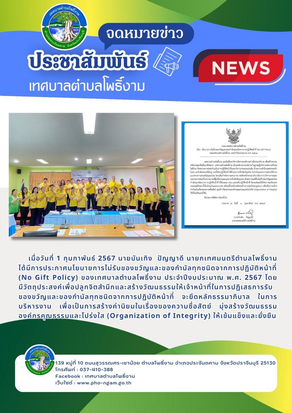 ประกาศนโยบายการไม่รับของขวัญและของกำนัลทุกชนิดจากการปฏิบัติหน้าที่ (No Gift Policy) [1 กุมภาพันธ์ 2567]