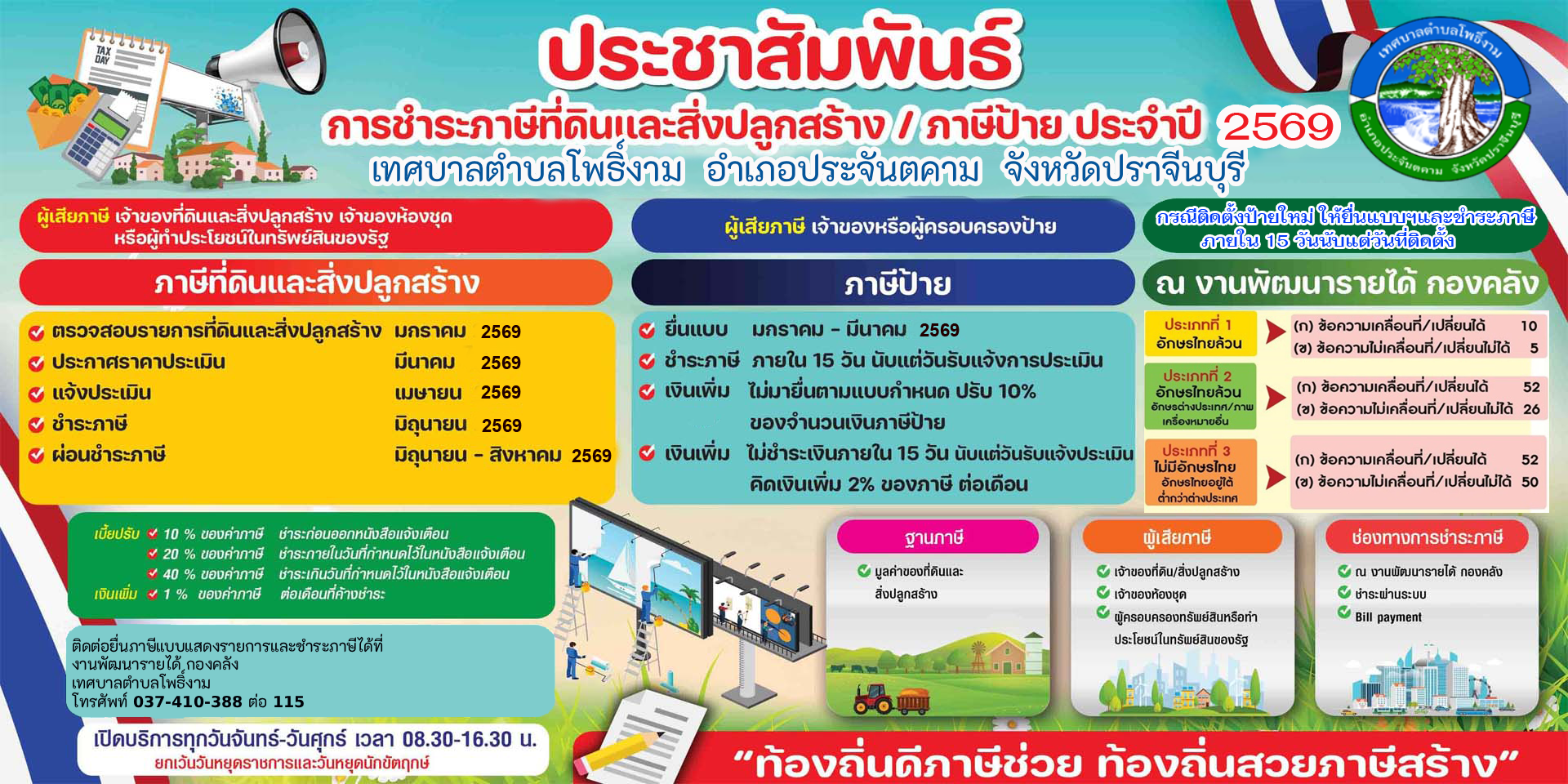 ประชาสัมพันธ์ การชำระภาษีที่ดินและสิ่งปลูกสร้าง และภาษีป้าย ประจำปี 2569